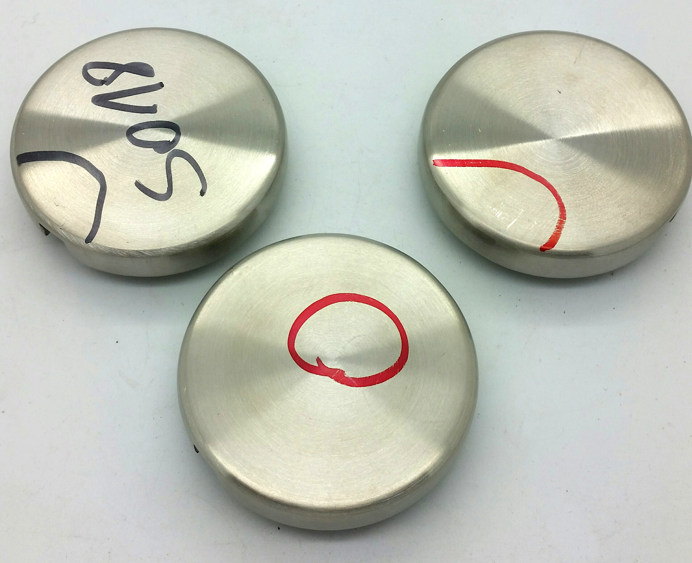 Transportschaden 1 Posten = 3 Stück V2A Ronde 60 x 10 mm, Gewinde-Bohrung M12 (Sackgewinde, nicht durchgehend), sichtbare Oberfläche Korn 240 geschliffen, Kappe speziell für Treppenkonstruktionen, siehe auf BDH 1012 ….