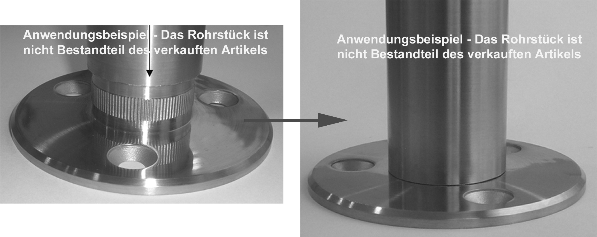 Edelstahl Bodenhalter mit Rändel, für Pfosten 42,4 x 2 mm zum Stecken und Kleben, mit Bodenplatte 100 x 5mm, 3 Bohrungen für Senkschrauben M8 oder Holzsenkschrauben 8mm, Korn 240 geschliffen, Höhe des Zapfens über der Ronde ca. 50 mm
